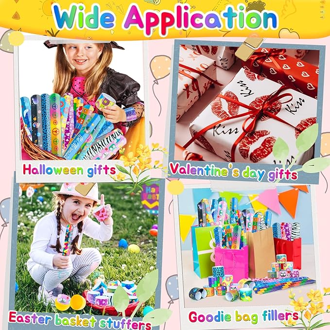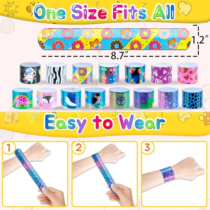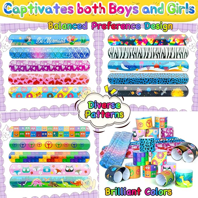 - 🌱🎡【Enjoy Versatile Slap Bracelet Everywhere】🍁🌎These slap bands bulk prizes for kids are a popular and versatile accessory that can be worn anytime, anywhere, whether you're going to school, work, out with friends or a special event. Also can be worked for goodie bag fillers, Christmas stocking stuffers, pinata stuffers, Easter basket stuffers, carnival prizes, class prizes, trick or treat toys, trunk or treat toys, etc.