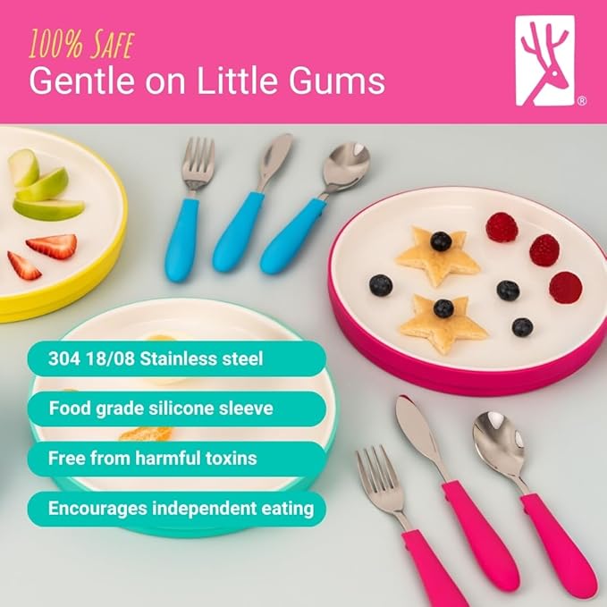 - SILICONE HANDLE: The Elk and Friends spoon, fork and knife feature a stainless steel tip and a easy to grip ergonomic anti-slip silicone handle making it easy for small hands to hold.