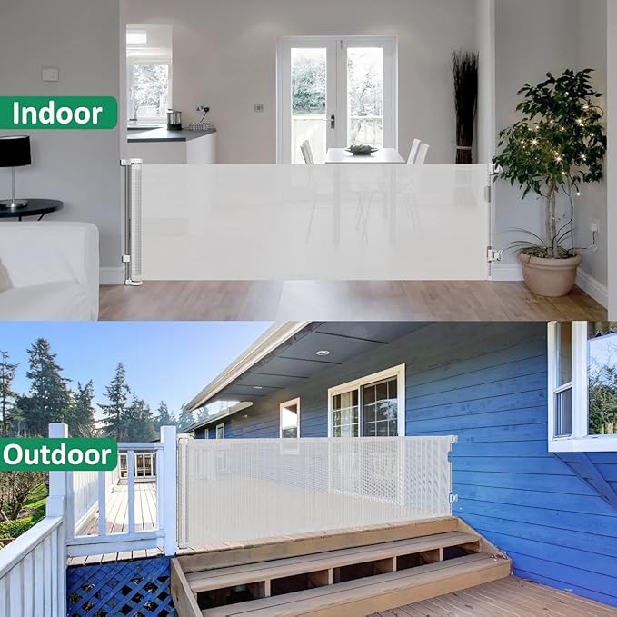 - [Perfect for Indoor and Outdoor] Each set contains 1 extra wide retractable baby gate and required mounting accessories. Large baby gate can be used for doorways, stairs and hallways both indoors and outdoors.