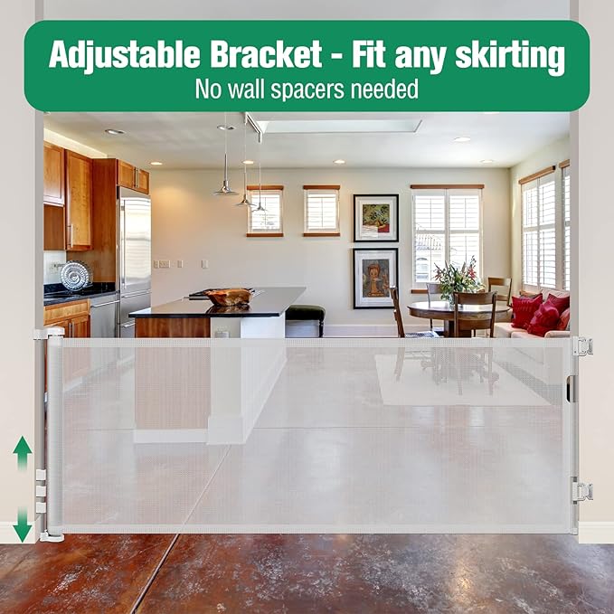 - [Fits Any Baseboard] This retractable dog gate has an adjustable lower bracket that fits any baseboard without wall spacers, making it safer, more practical and easier to install.