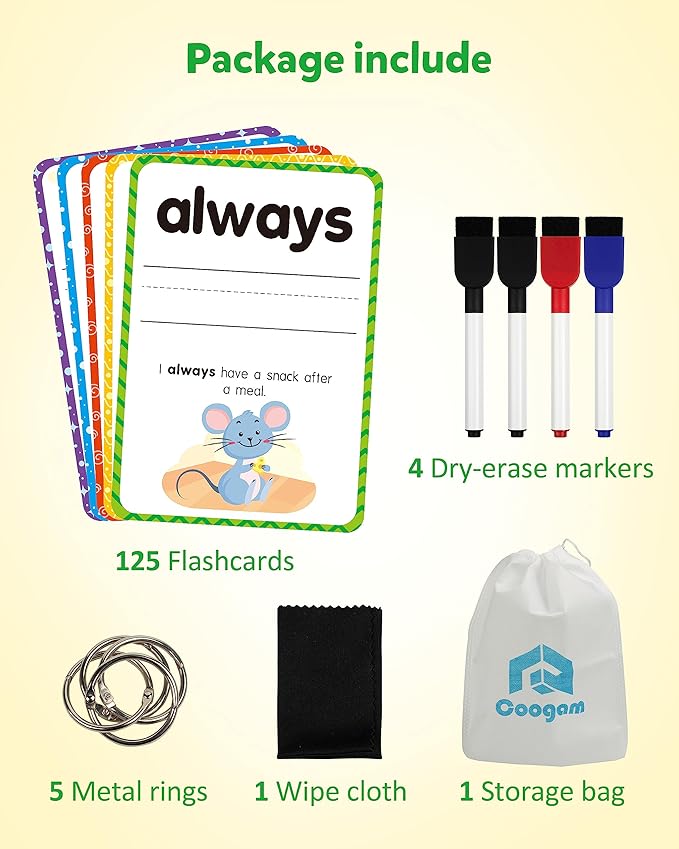 - Learn Sight Words with Sentences: This Sight word learning flash card set has 5 different levels of difficulty, each level has 50 words with related sentences. Comes with 4 dry-erase markers for kids to spell and write on these flashcards, helping them to get a better understanding of daily common words!