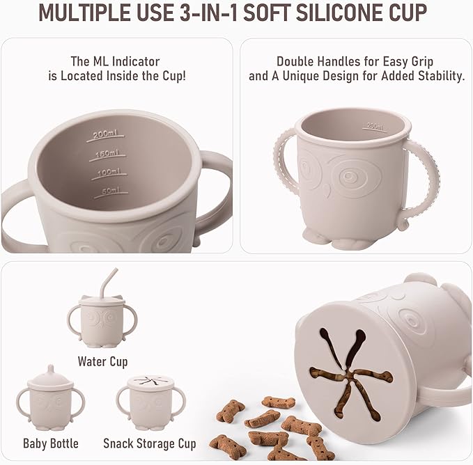 - Unique Designed Toddler Feeding Set: The baby spoon and fork in the infant weaning set are designed according to human mechanics, and the size is just suitable for babies aged 4 to 48 months; The matching silicone cup with 3 lids can not only serve as a baby bottle, also as a water cup and snack storage cup, babies can easily learn self-feeding skills using our silicone cup set.