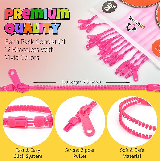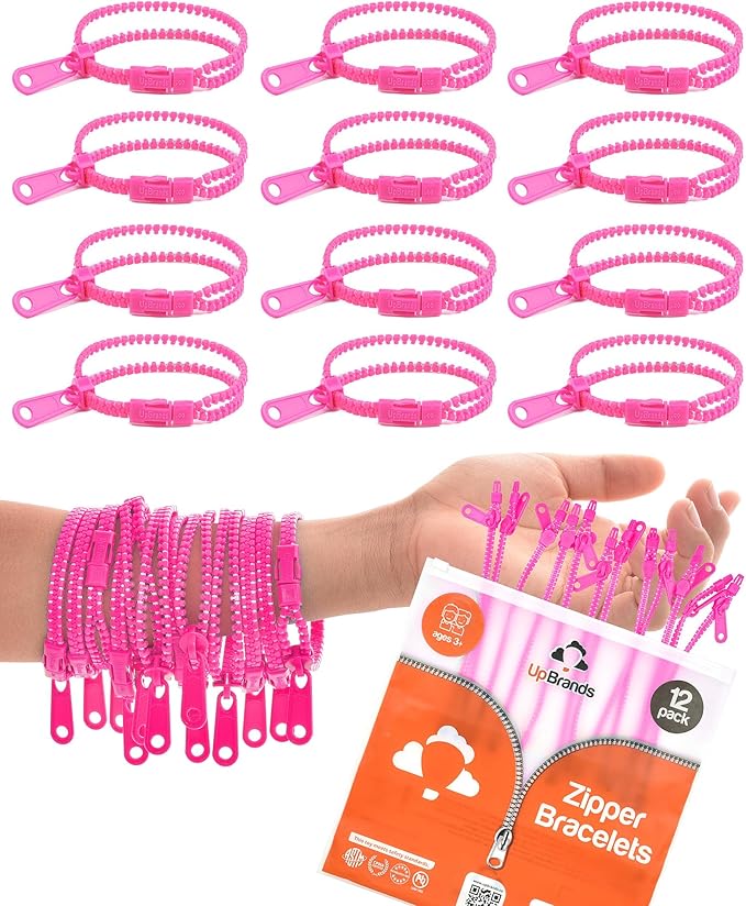 - How many fidget toys come in the pack? The pack includes a total of 12 UpBrands pink zipper bracelets, each measuring 7 inches. These vibrant, single-color bracelets are perfect for sharing, group activities, or ensuring you always have a fun and practical sensory toy on hand. Their lively pink color and engaging design make them ideal for kids and adults alike, providing a playful and enjoyable sensory experience for everyone.