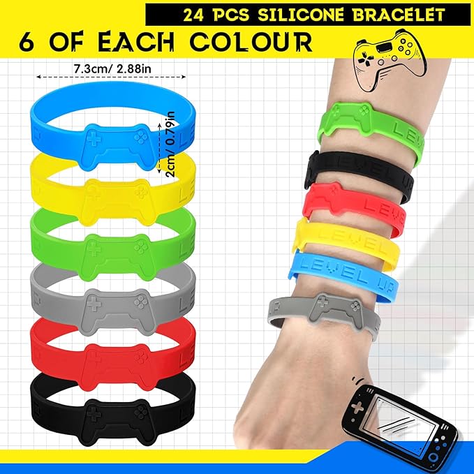 - Video Game Party Favors: you will receive 24 pieces of rubber bracelet in 6 colors, 24 game print stamp, 24 game print acrylic lobster keychain, a nice combination to meet your different needs