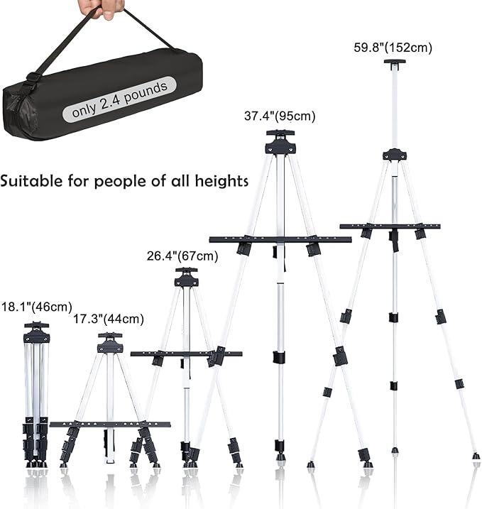 • Double holder portable artist easels for painting drawing canvas - The display part of artist easels stand can accommodate larger canvases or panels, and the easel's height can be adjusted according to individual needs, from 17.3 inches to 60 inches for you to choose. That is a adjustable artist easels stand for you.You can use the shelf to keep the creative process convenient and tidy, Convenient retractable easel stand is suitable for professional art portraits and painting work.