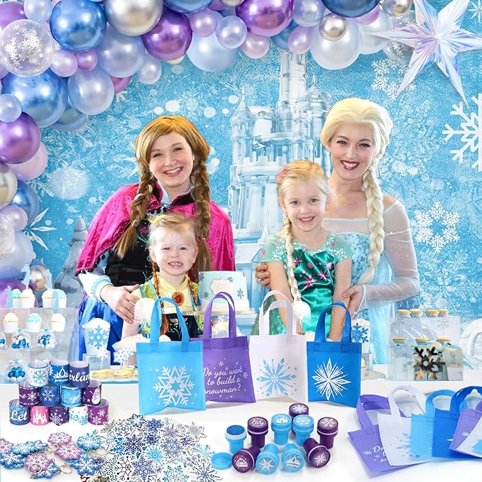 - Go Frozen Party: Stampers and slap bracelets are custom products that add to the uniqueness of the product. Children can give each other gifts with tote bags, decorate school bags with keychains, and fully enjoy the joy of stickers. Our set can help you hold a frozen birthday party and is an ideal match for elsa frozen birthday party decorations. Winter onederland party favors, winter party favors, winter wonderland party favors, snowflake party favors