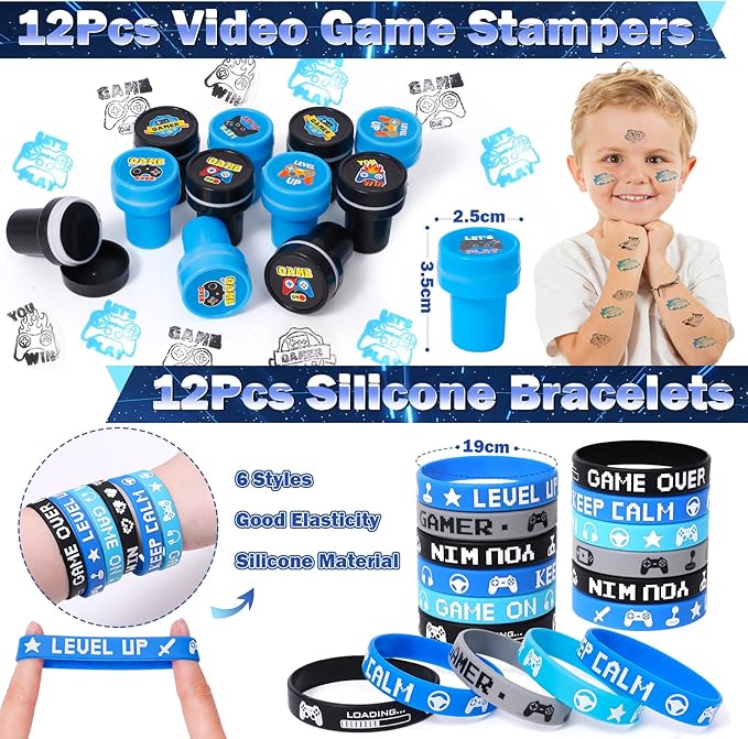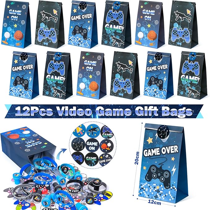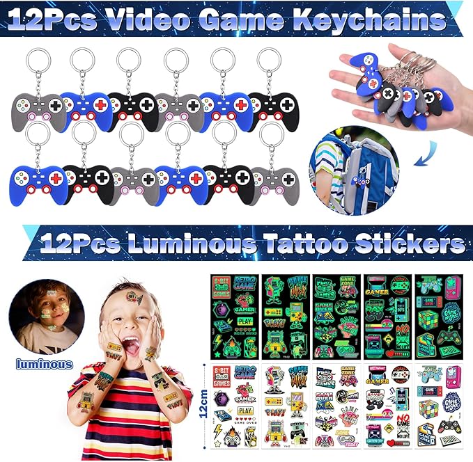 - 136Pcs Video Game Party Favors: We have carefully prepared a set of luxurious and complete game-themed party favors for game fans. It includes 12 drinking straws (6 styles), 12 VIP pass holder tickets, 12 paper bags (with stickers), 12 silicone bracelets (6 styles), 12 game stampers, 12 glow-in-the-dark tattoo stickers, 12 keychains, 50 game stickers. Our kit can help you throw a big party for 12 little ones and bring a lot of fun to the kids