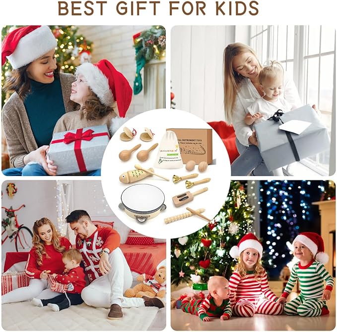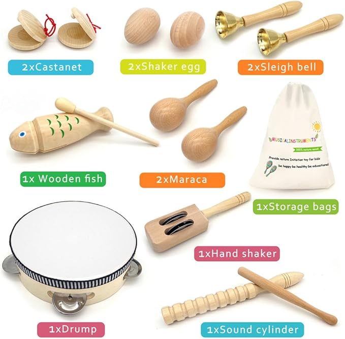 - Multiple Intrusments:Kid muscial instrument sets contains castanet,shaker egg,sleigh bells,drump,maraca,hand shaker,wooden fish,storage bag etc.They are the perfect early learning educational toddler toys.Also,they are the best gift for birthday.