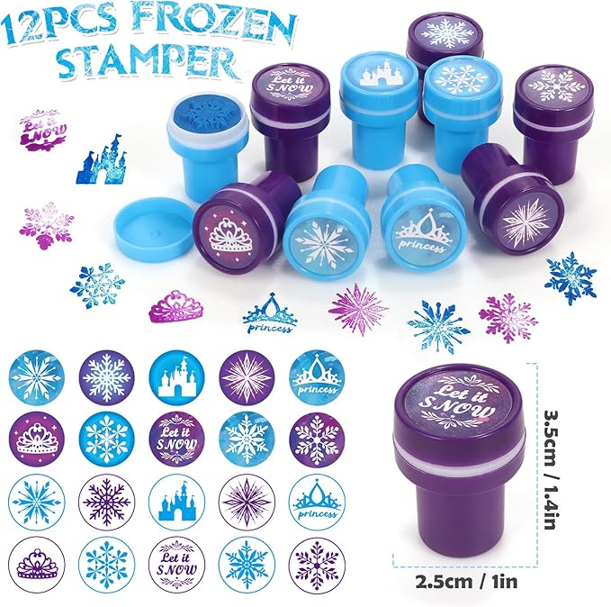 - Frozen Birthday Party Favors: We have carefully prepared a set of frozen themed party favors. It includes 12 paper bags (with 2 sealing stickers), 12 frozen stampers, 12 snowflake rings (blue and purple color), 12 snap bracelets, 12 frozen theme keychains, 50 snowflake stickers. This is a set of elegant party favors that can help you entertain 12 children and bring more happiness to kids