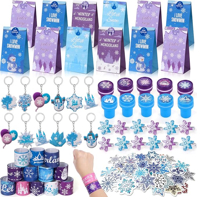 - High Quality Materials: Paper bags and snowflake stickers are made of high-quality paper, with solid and reliable quality. The slap bracelet, stamper, and ring are made of high-quality plastic and can be reused. The keychain is made of high-quality silicone and alloy, which is safe and non-toxic. All accessories comply with American toy standards and children can use them with confidence. Ideal winter themed party favors, winter onederland party favors, frozen goodie bag stuffers