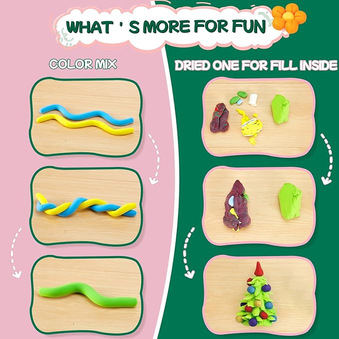• Mess-Free Fun: Our clay is designed to be non-sticky to hands, making it easy to shape and stretch without leaving a mess behind. It's light and soft, perfect for little hands to mold with ease.