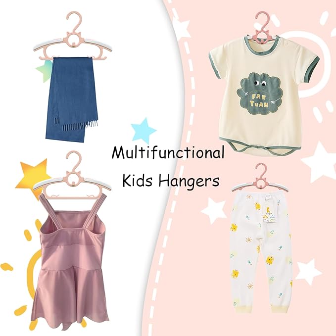 - 【Multifunctional Design】shoulder with anti-skid widened design of the hangers for baby clothes allows the shoulders to hang without wrinkling and warping and from slipping . Dual hooks on both sides of the kids hangers so that you can easily hang pants, shorts, or strappy tops, skirts, etc. as well fit pants under a shirt or jacket hanging over. 2 clips on the kids clothes hangers are designed for drying socks, towels. Windproof buckle can prevent baby hangers from falling in the wind