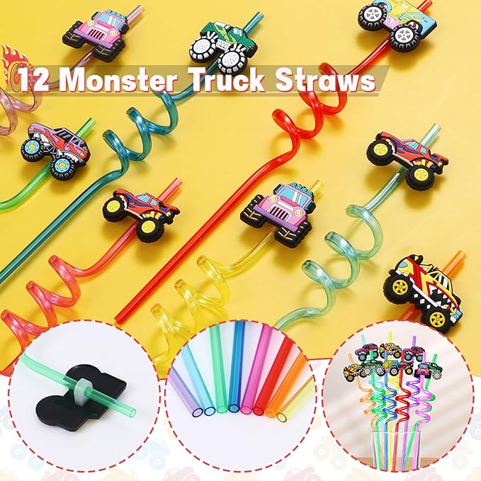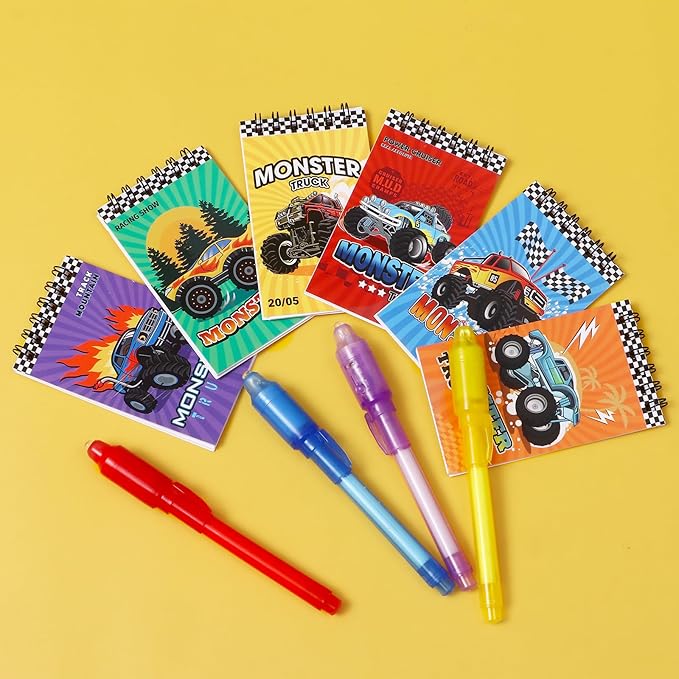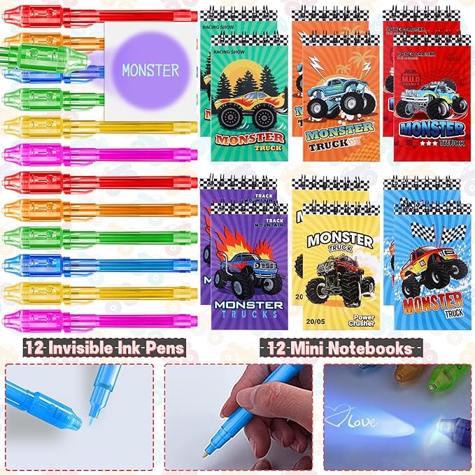 - Luxurious Monster Truck Party Favors Set: We have carefully prepared 84 pieces of monster truck birthday party favors. It includes 12 invisible ink pens, 12 mini notebooks (6 styles), 12 paper bags (with sealing sticker), 12 food-grade plastic straws (6 styles), 12 DIY stickers, 12 keychains, and 12 slap bracelets. This is a fun and rich set of party favors that can be used to entertain 12 children. Kids will be excited to receive these gift toys
