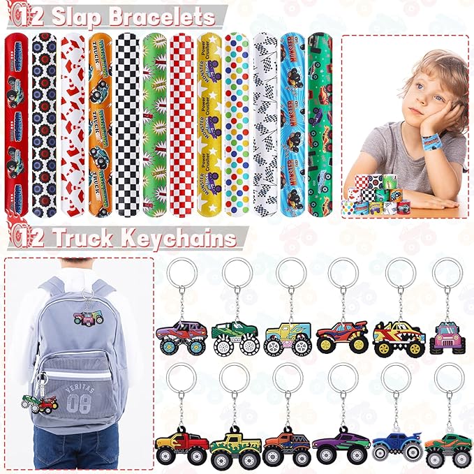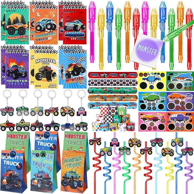 - Monster Truck Birthday Party Supplies: Unlike ordinary party favors sets, we have carefully prepared 7 different ideal accessories. Kids can use invisible pens to write blessings or secrets in mini notebooks, use cool straws to drink, and exquisite paper bags can be used to hold gifts; DIY stickers can improve kid's imagination and hands-on ability. Slap bracelet can be used as a daily decor, keychain can be used to decorate school bags. It's hard not to love these party favors for kids