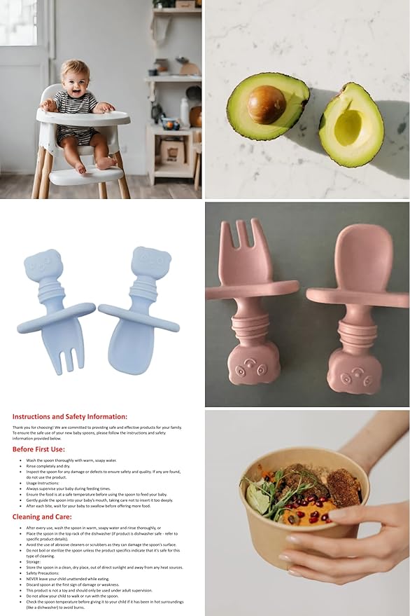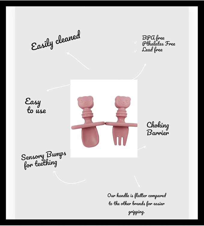 - DESIGN: ergonomically designed short flatter handle (unlike other silicone utensils on market) for better grip, the self feeding. It has ventilated choke barrier.