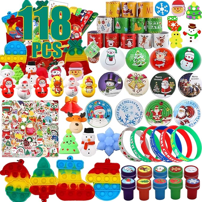- 【Christmas Favors Toys Pack Include】The new upgraded version of 118 Pcs Christmas party favors pack contains a variety of novel bulk Christmas themed toys, like 10 slap bracelets, 10 Christmas stamps, 60 Christmas stickers, 6 tumblers, 6 Christmas silicone wristbands, 4 maze puzzles, 4 mochi squishy toys, 4 pull back cars, 4 pop keychain toys, 5 Christmas buttons pins, 5 Christmas erasers. All toys are filled in an exquisite gift box. You can make Christmas 118 goodie bags for kids with our valuable Christmas-themed toys gift kit.