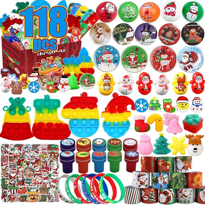 - Christmas Stocking Stuffers: 10 Christmas Stampers, 10 Christmas Slap Bracelets, 60 Christmas Stickers, 6 Tumbler Toys, 6 Christmas Silicone Wristbands, 4 Mochi Squishy Toys, 4 Pull Back Car, 4 Pop Fitget it Toys, 4 Maze Puzzles, 5 Christmas Buttons Pins, 5 Christmas Erasers. Total 118 Pcs Christmas Party Favors.