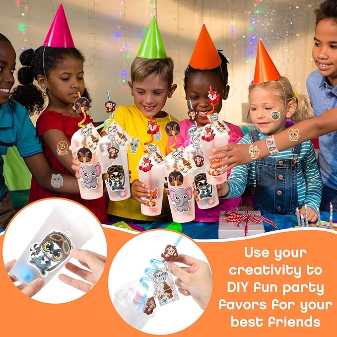 - Reliable and Durable: the animal slap bracelets for kids are made of PVC, durable, flexible, and comfortable to wear; The animal patterns on the rings, keychains, and straws are made of quality PVC materials, durable and hard to fade; The straw is made from plastic, reusable and easy to clean; Stickers are self adhesive waterproof PVC; The dessert cups are made of PP material that's reliable and safe to use; The thank you tags are made from kraft paper that does not fade easily