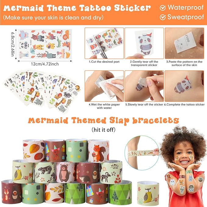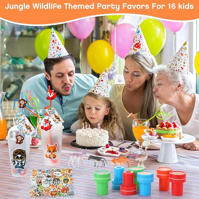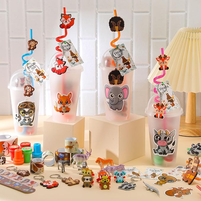 - Wide Array of Party Elements: no party is complete without the woodland animals decorations; Consisting of 16 units of each animal tattoo stickers, keychains, straws, kids' stamps, cups with lids, slap bracelets, thank you cards, puzzle stickers, PVC rings, and animal miniatures, this set is designed for amusement and fun for most people attending, which also comes with a wire roll, a pack of animal stickers, and a roll of round sticker, ensuring no aspect of fun is missed
