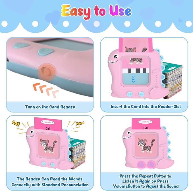 - 【 Easy to Use 】 - This talking flash cards reader can say words by inserting the corresponding word cards into the dinosaur reader, It will then pronounce the word in a standard American accent. It has a repeat button to repeat the sound, easy to use. Insert the animal and vehicle cards, the machine will imitate their voices. fun and scenes, making language vivid and interesting, helping children develop attention and memory skills. This Montessori toy makes children love to learn.