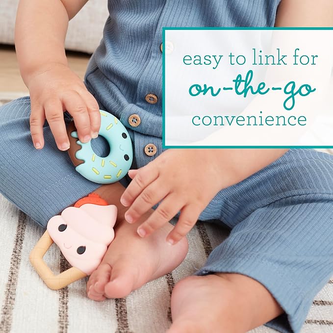 • INTERESTING TEXTURES: Ice cream and donut shapes with exciting textures to stimulate your little one’s mouthing senses, encouraging them to chew, nibble & teethe