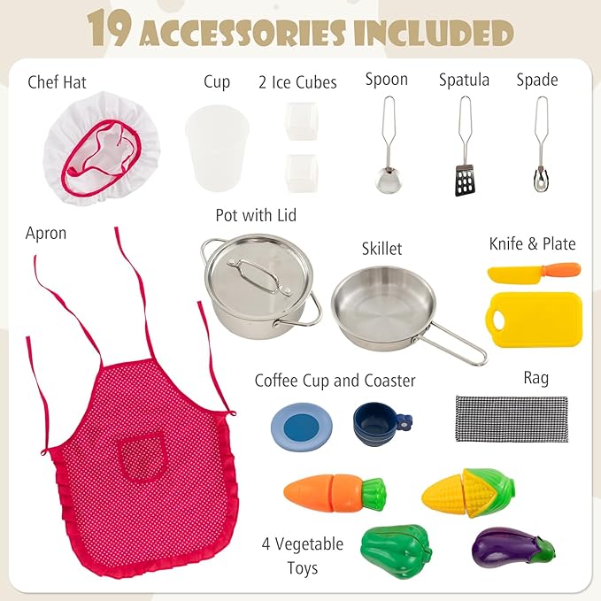• 🌟【Bonus 19 Accessories & Flexible Storage Space】This kid toddler kitchen play sets come with an apron, chef hat, rag, pan, pot with lid, cup, 2 ice cubes, 3 kitchen utensils, 4 cutting vegetables, knife & cutting board, teacup & cup mat. In addition, 3 hanging hooks, 2 open shelves, 2 non-woven fabric drawers, 3 enclosed cabinets and a 2-tier cabinet are provided for extra storage.