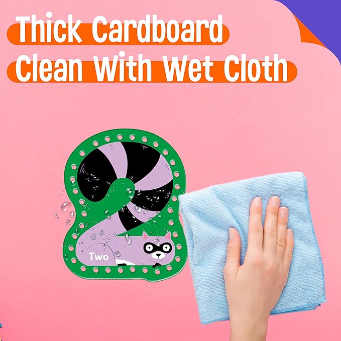 - Double-sided Printing: One side of the card is an adorable animal in a number-shape, another side is the corresponding amount of this number (Especially explained the concept of zero). The patterns on cards are colorful, big and vibrant. The holes are clearly cut and easy for preschoolers to work with. The strings are easy for children to use and fit into the holes easily.