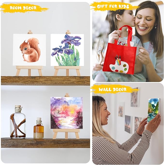- Art Supplies For Kids - Each box contains 12 mini watercolor paint sets, 12 canvas bags, 12 child-sized aprons in 3 colors, and 12 painting canvas panels with a little wooden easel. A total of 48 gift sets for painting may be used to teach kids about various colors and painting techniques at a young age. The quantity is sufficient to meet the needs of 12 children for watercolor painting.