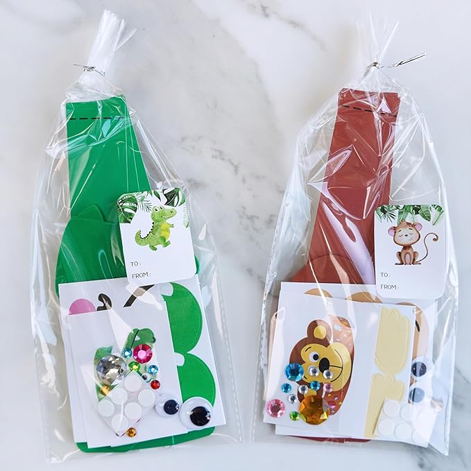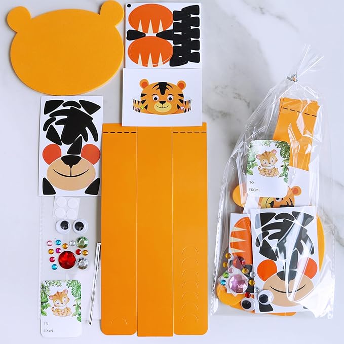 - Materials & Easy Assembly: Jungle Animal headbands are made of 129 lb, 350 GSM cardstock. the jungle animal headbands feature die-cut, self-adhesive foam stickers and plastic googly eyes. The kit also includes polyester satin cords and plastic treat bags. Easy to assemble and enjoyable to wear, these crafts encourage fun and creativity for all ages. Simply use the peel-and-stick stickers to create your jungle animal headbands, then attach the adjustable strips to finalize the design.