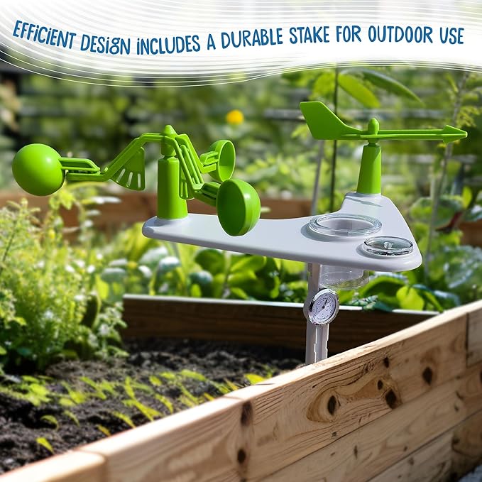 - Built-in tools include: wind vane, compass, rain gauge, anemometer (wind speed indicator), and thermometer to monitor, observe, and record weather data.