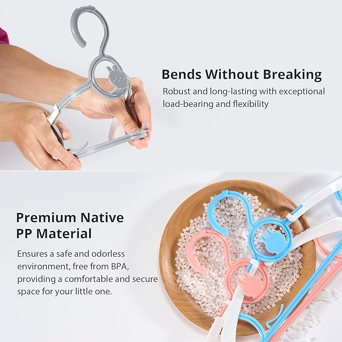 - Premium Material and Non-Slip:Crafted from safe and durable PP material, our hangers for baby clothes feature a smooth surface that reduces the risk of scratches. Anti-slip design of kids clothes hangers on the shoulder prevents clothes from slipping off