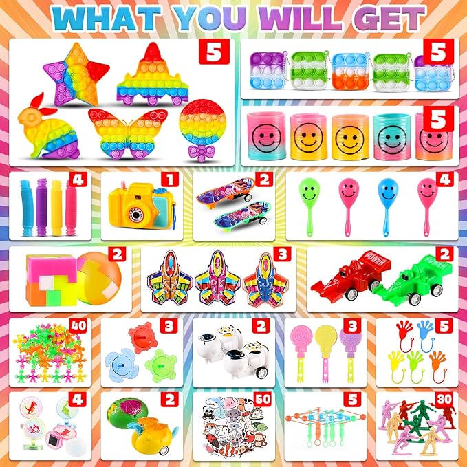 - IDEAL GIFTS IDEAS: The fidget assortment party favors toys are the first gifts choice for kids birthday party gifts, classroom treasure box prizes,carnival prizes in bulk,holiday gifts,pinata stuffers, goodie bags stuffers, birthday party favors,giveaway gifts toys,return gifts party toys,Christmas stocking stuffers,party favors for kids8-12 and etc,.Various toys bulk with bright colors, boys girls can choose their favorite toys,must become a hit on party favors.
