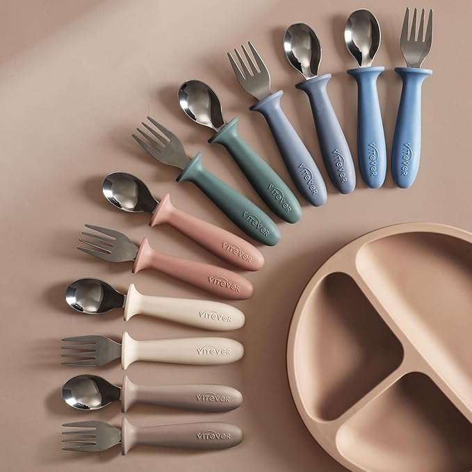 - ENCOURAGE INDEPENDENT EATING: Available in 3 soft colors of 6 pieces, each color includes a spoon & fork set to help your little ones learn self-eating. With three fun colors to choose from, your child will love digging into their favorite foods. Perfect choice for parents who want a safe and practical solution for their little one's mealtime needs.