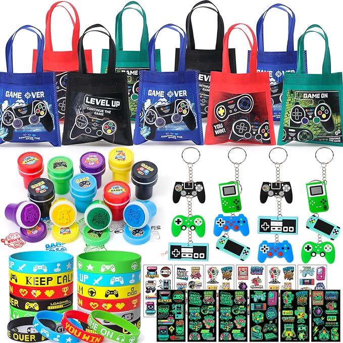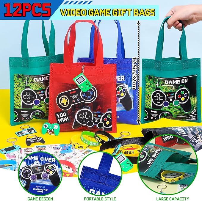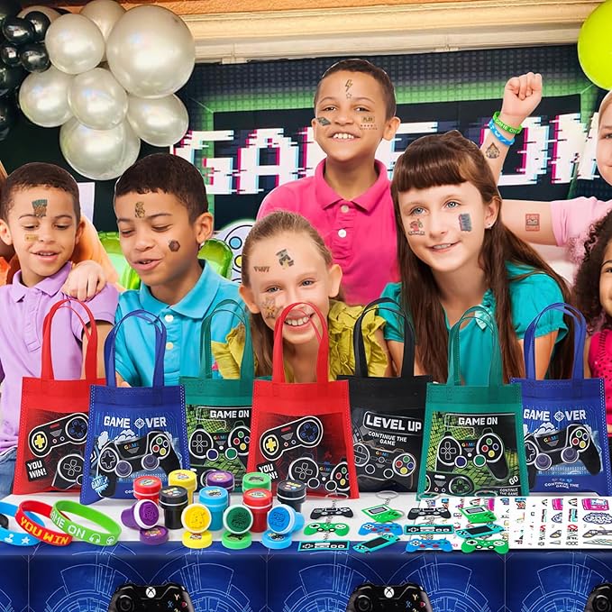 - Fun Gamer Party Favors - We have carefully prepared 5 accessories, each with fun game elements. The non-woven tote bag is an exclusive design with solid quality. Game stamper features an exclusive design with additional graphics. Children can also wear comfortable silicone bracelets, enjoy glow-in-the-dark tattoo stickers, decorate school bags with keychains, and more. Kids will be delighted to receive these party gifts