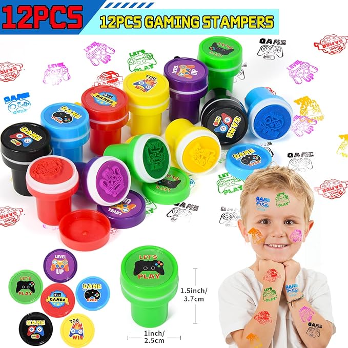 - 12 Sets Video Game Party Favors - Games are a popular theme and we have carefully prepared 12 sets of game themed party favors. It includes 12 non-woven bags (4 styles, exclusive design), 12 silicone bracelets (6 styles), 12 stampers (6 styles, exclusive design), 12 keychains (6 styles), 12 sheets glow-in-the-dark tattoo stickers. Our set can help you entertain up to 12 kids and help them have a fun party