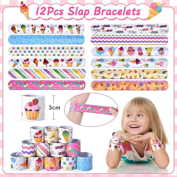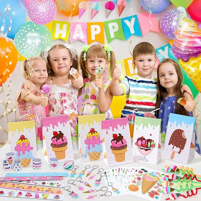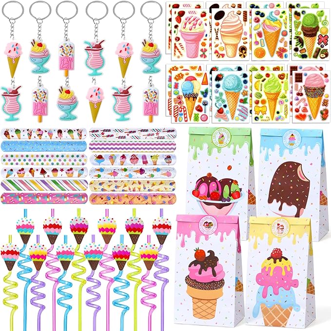 - Pastel Ice Cream Party Favors: Ice cream symbolizes sweetness and happiness, and children will be happy to receive such party favors. We have carefully prepared 12 drinking straws (random colors), 12 paper bags (with sealing stickers), 16 DIY stickers, 12 ice cream keychains, and 12 slap bracelets. Our kit can help you host an ice cream party for 12 kids