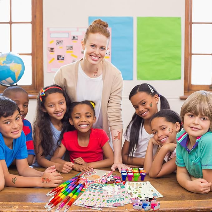 - Safe Material and Reliable Materials: the llamas birthday party decoration supplies have been strictly tested, made of quality materials, and safe with smooth surfaces; Tattoos can be easily removed with makeup remover,and our stacking buildable 12 colors crayons are made of paraffin and plastic,stamps are made of plastic, other stickers are made of paper, nontoxic, safe material, safe for children to use
