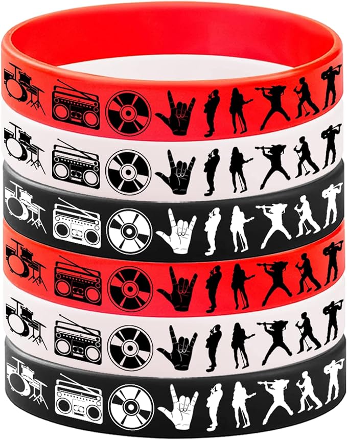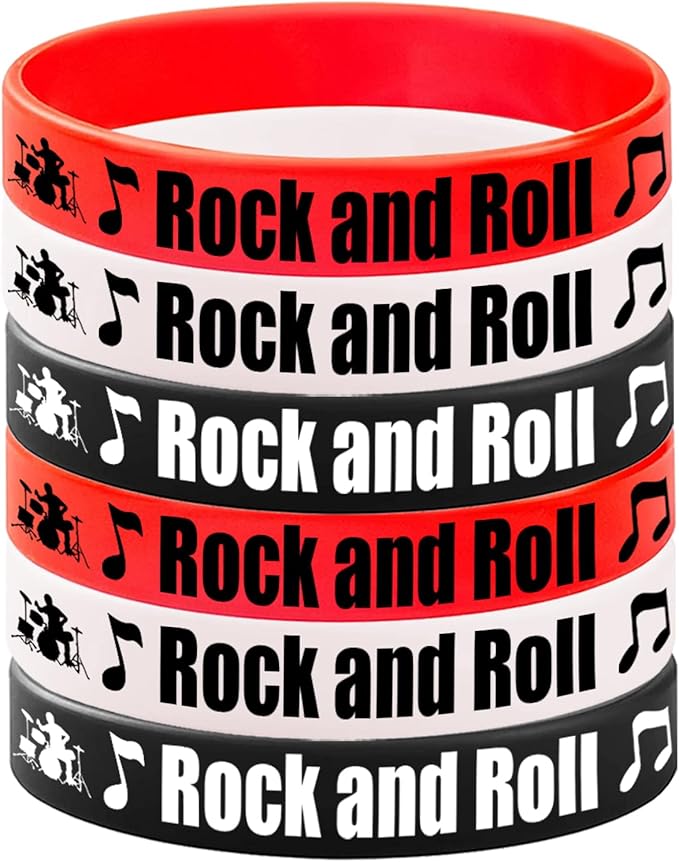 - Rock and roll Silicone Bracelets Set:48 pieces of rock and roll themed rubber bracelets with 3 different colors, black, red and white.