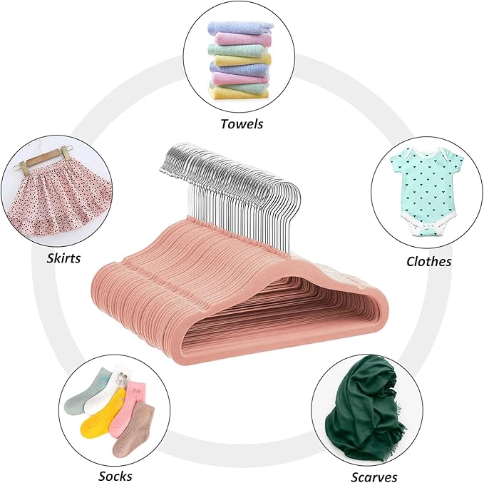 - 【Non-slip design】- The baby hangers are covered with soft, non-slip, odourless and non-shedding velvet, which is more suitable for toddler clothes. The curved shoulders of the children's hanger keep your child's clothes in good shape and protect them from wrinkling or deformation. The V-shaped grooves at the ends of the hanger prevent baby's clothes/children's dresses from slipping off.