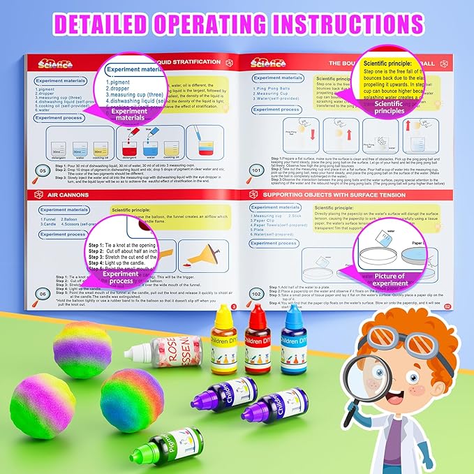 - 【EASY TO FOLLOW INSTRUCTIONS】 The science kit for kids includes instruction manuals about the experiment materials you need, experiment process with clear illustrations for each step ensure that kids can follow along and complete experiment, and scientific principle help kids to know how the world works.
