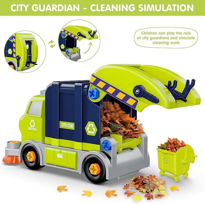 - Guardians of the City: Our playset is an electric disassembly toy garbage truck with the theme of city cleaning. Your kids can enjoy playing the role of a city guardian, simulating the daily work of city cleaners. Such an educational game experience
