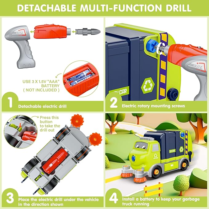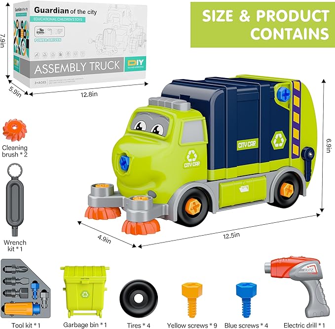 - DIY Assembly Fun: A great value take apart playset with all the accessories. It comes with a DIY assembled cleaning truck (contains garbage bin, garbage can holder, plastic screws, cleaning brush, front tires and rear tires), 1 electric drill, 1 tool kit and 1 wrench kit. Build all the pieces together and electrically drive the truck for endless fun and learning about STEM concepts