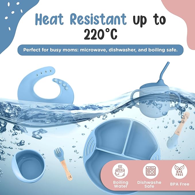 - [Everything You Need] The baby feeding set includes everything you need for baby feeding. 1 divided suction plate, 1 suction bowl, 1 adjustable bib, 1 drinking cup,1 snack container, 1 silicone spoon & fork set, spoon & fork small baby and textile bib. No more wasting time to buy one by one