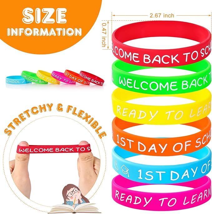 - Perfect Back to School Gift: These colorful welcome back to school bracelets are great for parents and teachers to give the kids as a school motivational gift. Each back to school bracelet is printed with some cheerful words that expresses the students' enthusiasm for going back to school! Back to school teacher gifts, back to school gift bags, back to school gift basket, back to school gift, first day of school teacher gifts, first day of school gifts, first day of school gifts for boys.