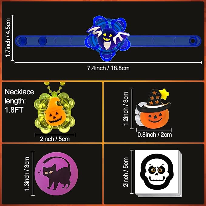 - [ Halloween elements ] Like Pumpkin, Spider, Bat, Ghost, Skull with the bright vibrant colors. The Necklaces Bracelets can be rotating, and led ring can flash for blue or red light, and temporary tattoos will glow in the dark. These light up flash Halloween toys will very popular party favors or kids hot bulk toys or so attractive to kids for Halloween treat bags or Halloween party supplies