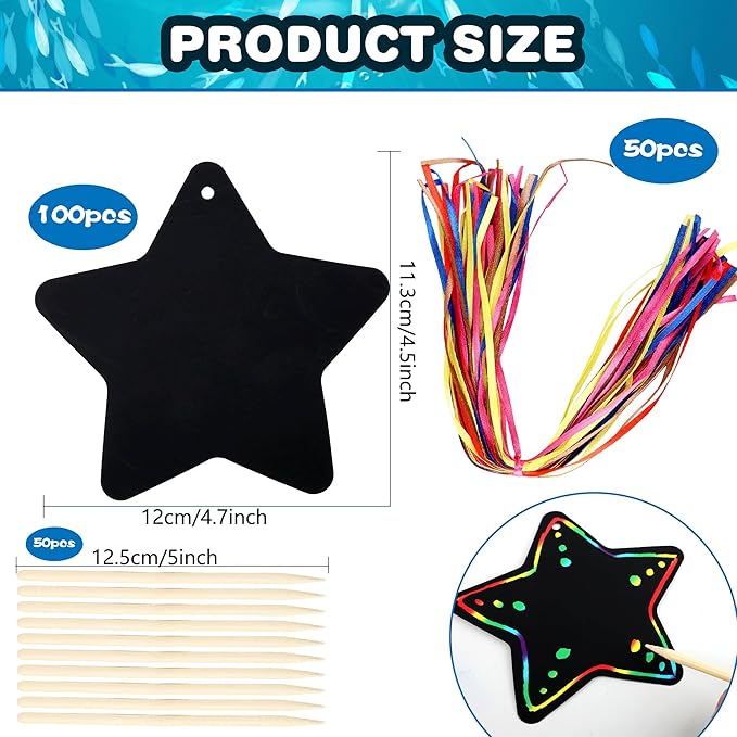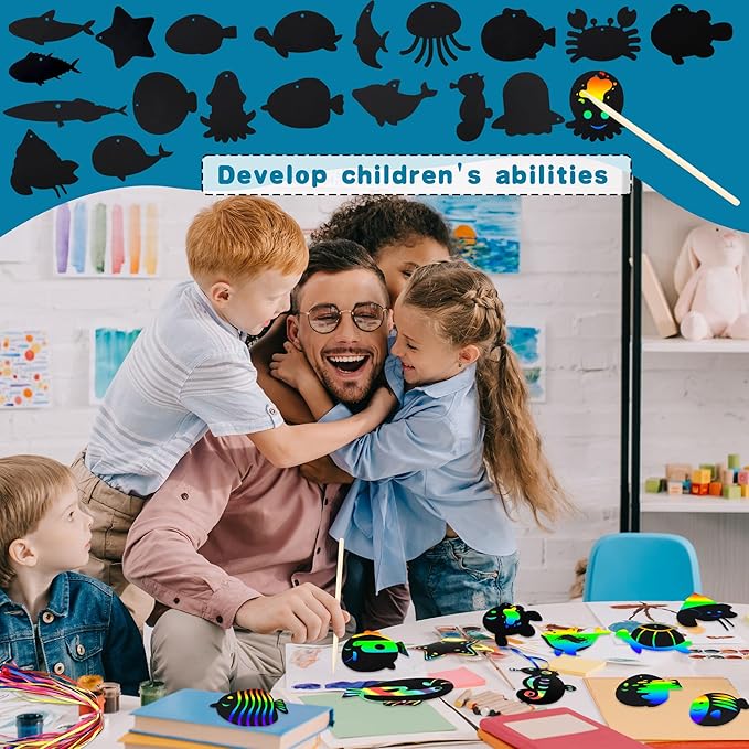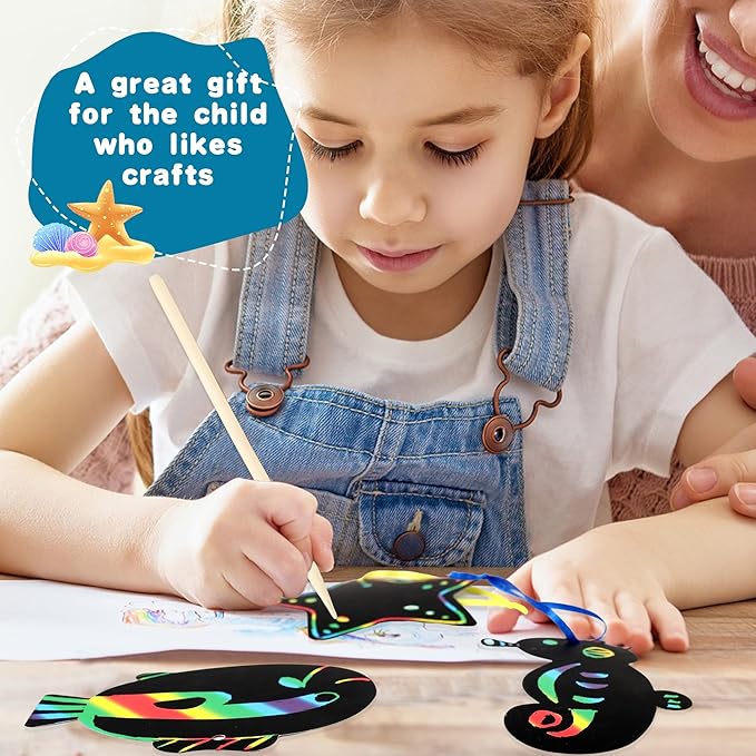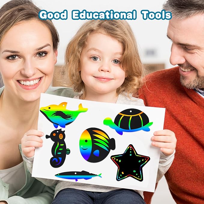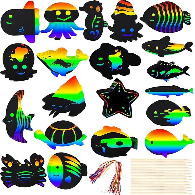 - 【Quality Material】: Kids rainbow sea life scratch card crafts are made of paper material, safe and reliable, the card is coated with a black surface layer, durable, the diverse sizes and shapes provide a visually fascinating effect, the sturdy stick helps you easily and effectively scratch the surface of the card, ensuring a satisfying use experience