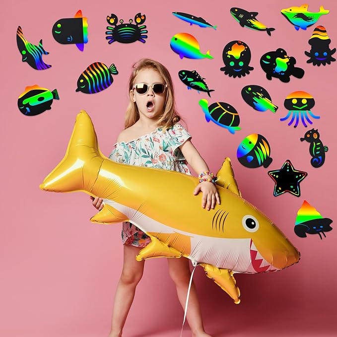 - 【Fun DIY Activity】: Ocean animals scratch cards sets offer a fun DIY activity where you can use the provided sticks to scratch off the surface layer to reveal the beautiful rainbow colors underneath. The ribbons make it easy to hang these scratch-off decorations on backyard walls, ceilings, doorways, tree branches, or use the included sticky dots to stick them on windows or other surfaces