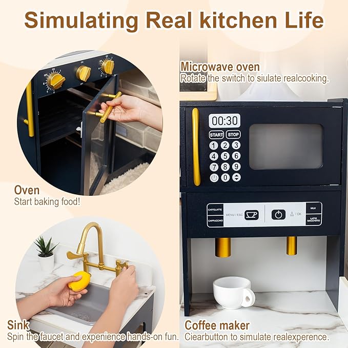 • Plenty of Play Features: This kids kitchen playset includes a range of captivating features, such as a stove and range hood with lights and sounds, a refrigerator, an ice maker, a microwave, an oven, a coffee maker, a sink, and categorized storage baskets. It also comes with 14 pcs colorful accessories to inspire endless imagination. The knobs make a "click-clack" sound, providing tactile and auditory feedback, while the ice maker pretends to dispense ice cubes.