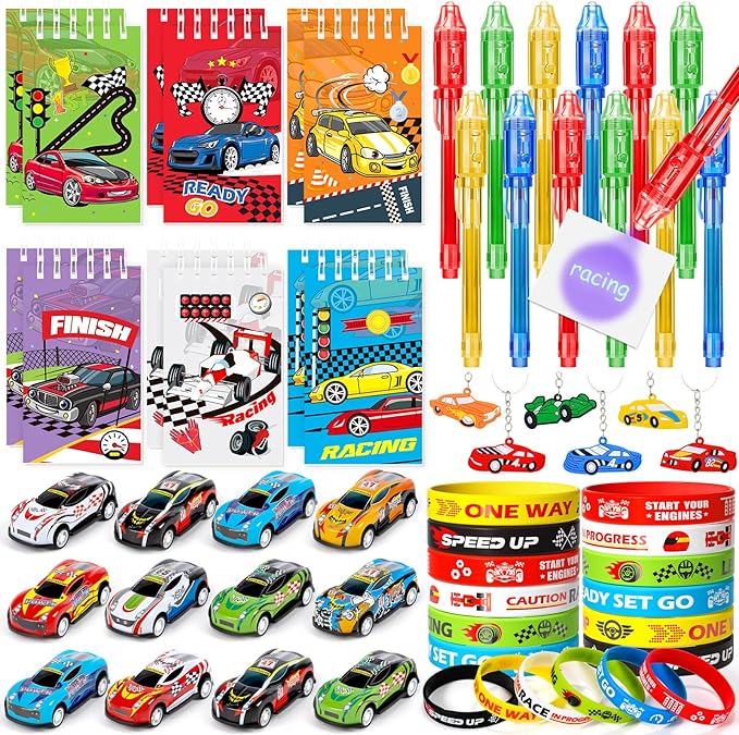 - 60Pcs Race Car Party Favors - This value pack includes 12 sets of race car favors, consisting of 12 invisible ink pens with UV light, 12 spiral notepads, 12 mini race car toys, 12 keychains, and 12 silicone bracelets. With a wide range of accessories, our race car party favors offer an extensive selection for your themed celebration.