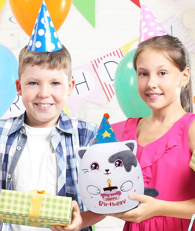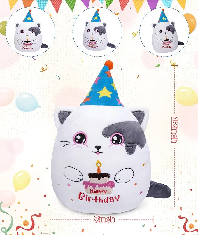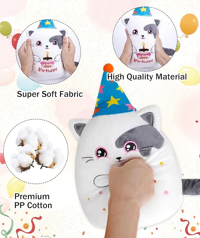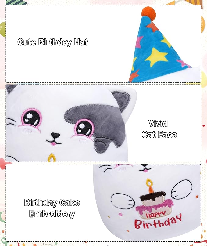 - Unique Birthday Plushie Design: Our Blue Whtie cat stuffed animals features have happy cute pet's expression. The most distinctive feature is that Brithday Hat on the head and Birthday Cake embroidery on belly. Looking at it, it seems like saying happy birthday to you. You will really want to give the cat plusie a big hug. It is the perfect birthday party design